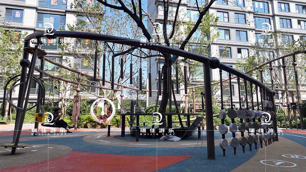 該社區游樂場地中央有兩棵大樹,無需為設施“讓道”,無動力游樂設備可直接環樹而建。我們以樹木為核心,定制環形游樂設施,不僅可以保留樹木的自然景觀,還能讓場地中間預留出充足的行走通道,避免擁擠,整體造型開闊大氣,既滿足了繞樹嬉戲的樂趣,又兼顧其美觀度。