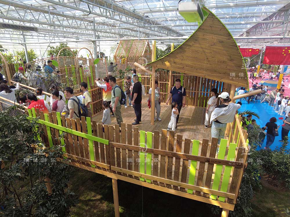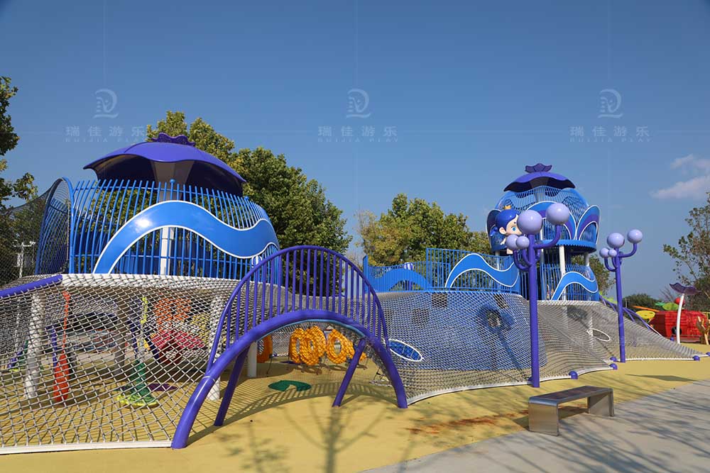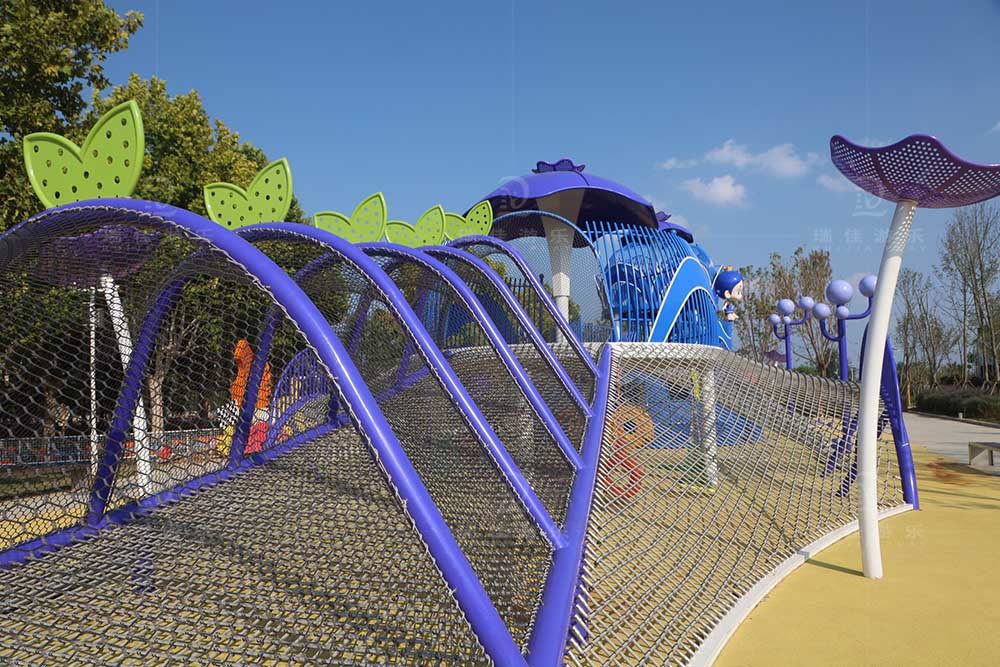 藍莓密林魔網攀爬區是專為低齡兒童設計的“低空探索樂園”,以藍莓為主題造型,將攀爬網與趣味小型無動力設備相結合,既還原穿梭藍莓園的沉浸感,又通過低強度攀爬鍛煉孩子肢體能力,是安全與趣味并存的核心游玩區。
