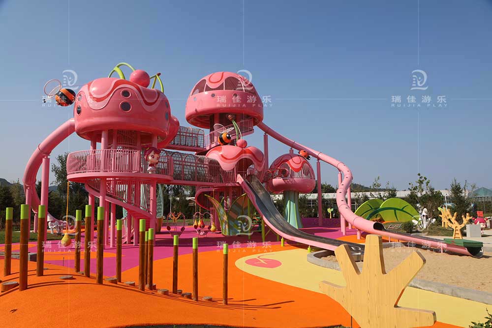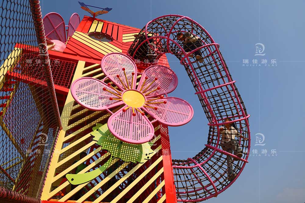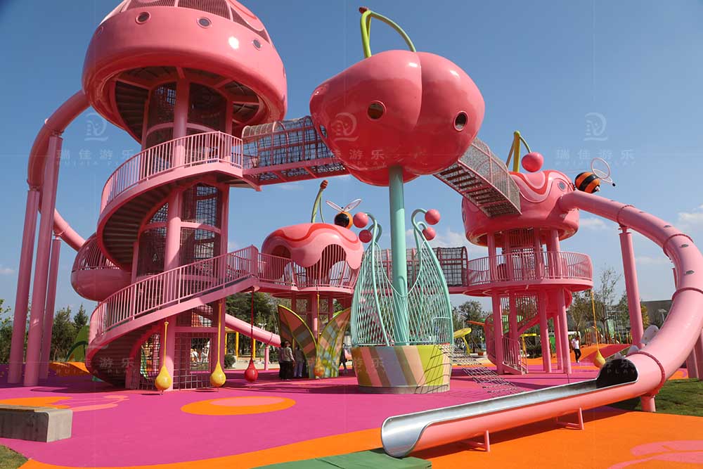 無動力“奇幻櫻桃島”屬于高塔滑梯組合區是集趣味、運動與觀賞于一體的大型戶外游樂設施,它以其獨特的櫻桃造型成為園區內地標性的存在。在以安全為前提的情況下,為了增加奇幻櫻桃島的趣味性,無動力櫻桃主設備上共設有滑梯、攀爬拓展、螺旋爬網、秋千、坡面攀爬等多種游玩設施,其中滑梯共有3個,分別包含板滑和桶滑,高度各不相同,適合全齡朋友游玩。