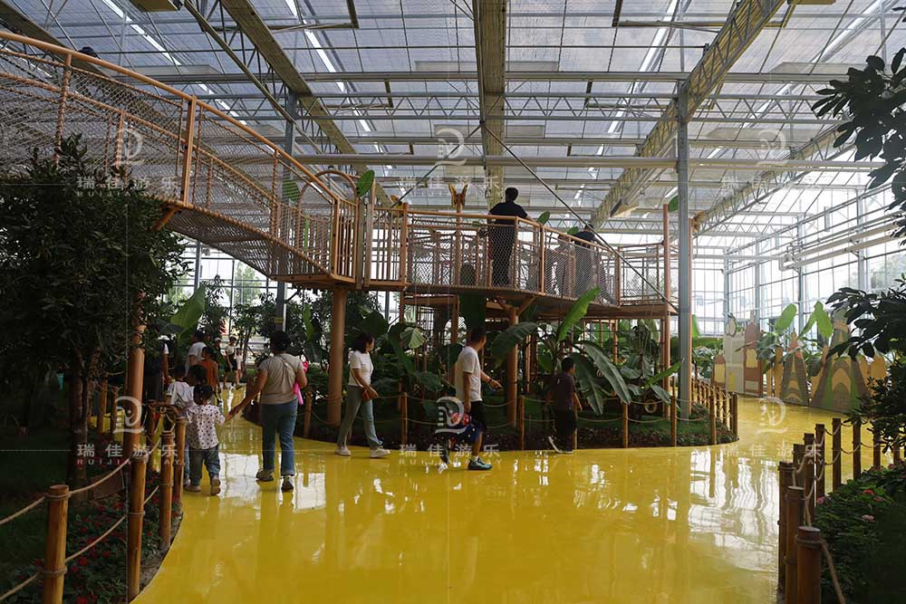 淘氣雨林館的設計藏著細膩巧思:無動力游樂設施沒有選擇跳脫的亮色,而是提取館內植物的自然色系,讓設施與植物在色彩上互為呼應,既保留了玩樂的活力,又讓整體空間滿是雨林的靜謐與和諧。